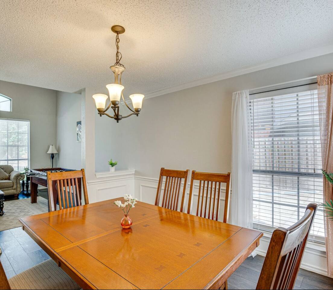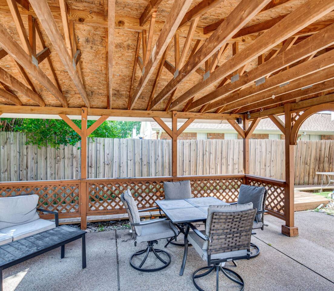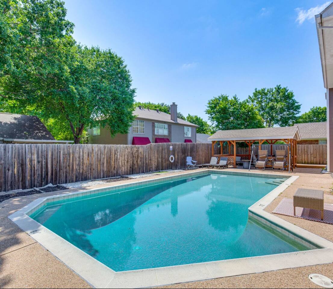This inviting home in the heart of Grand Prairie TX is a short drive to the Dallas Cowboys and Texas Rangers stadiums. In a short drive you'll find Water Parks, Six Flags over Texas, Shopping, and Restaurants. Ideal for families, sports fans, and travelers on vacation or business looking for a home base near major attractions. The prime location coupled with the swimming pool and Cozy beds make this home the perfect balance of convenience and comfort. Our outdoor space is designed for relaxation and fun! Take a swim in the pool and enjoy the Gazebo where you'll find plenty of seating to unwind. Fire up the BBQ grill for a cookout on our grill.