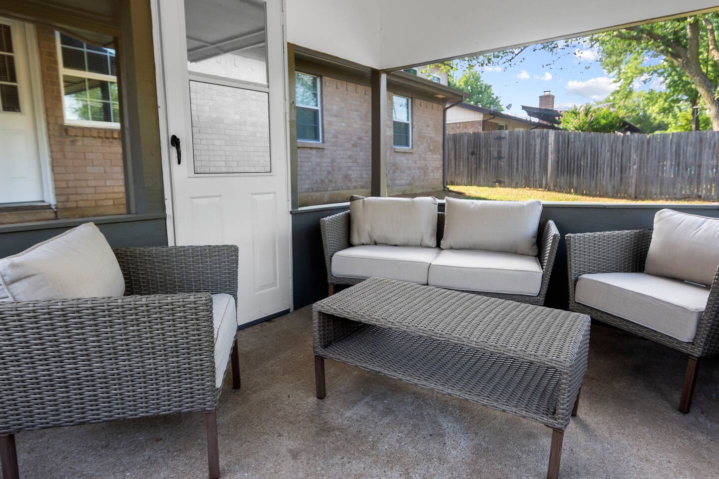 Enjoy the covered patio out back with an enclosed sitting area
